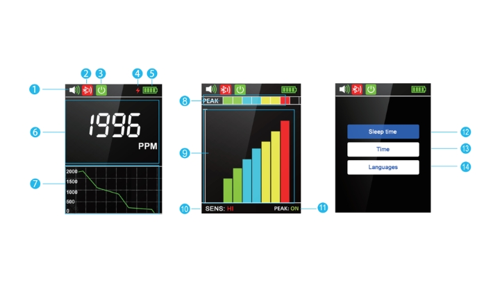 Lưu ý: Chức năng PEAK phải được BẬT. - Giá trị rò rỉ: Cho biết mức rò rỉ hiện tại được phát hiện. Nồng độ rò rỉ càng cao, vạch càng cao.