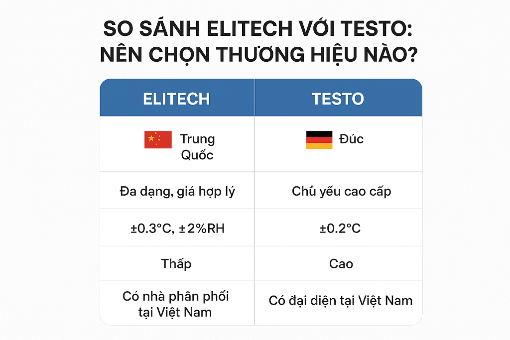 Dưới đây là so sánh chi tiết giữa Elitech và Testo để bạn có cái nhìn rõ ràng hơn trước khi quyết định.